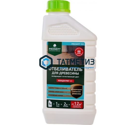 Отбеливатель для древесины PROSEPT 50 концентрат, 1л 001-1 предназначен для удаления грибов, плесени, серого налета на глубине до 3 мм. Подходит для обработки тары и паллет, используемых в пищевой промышленности.